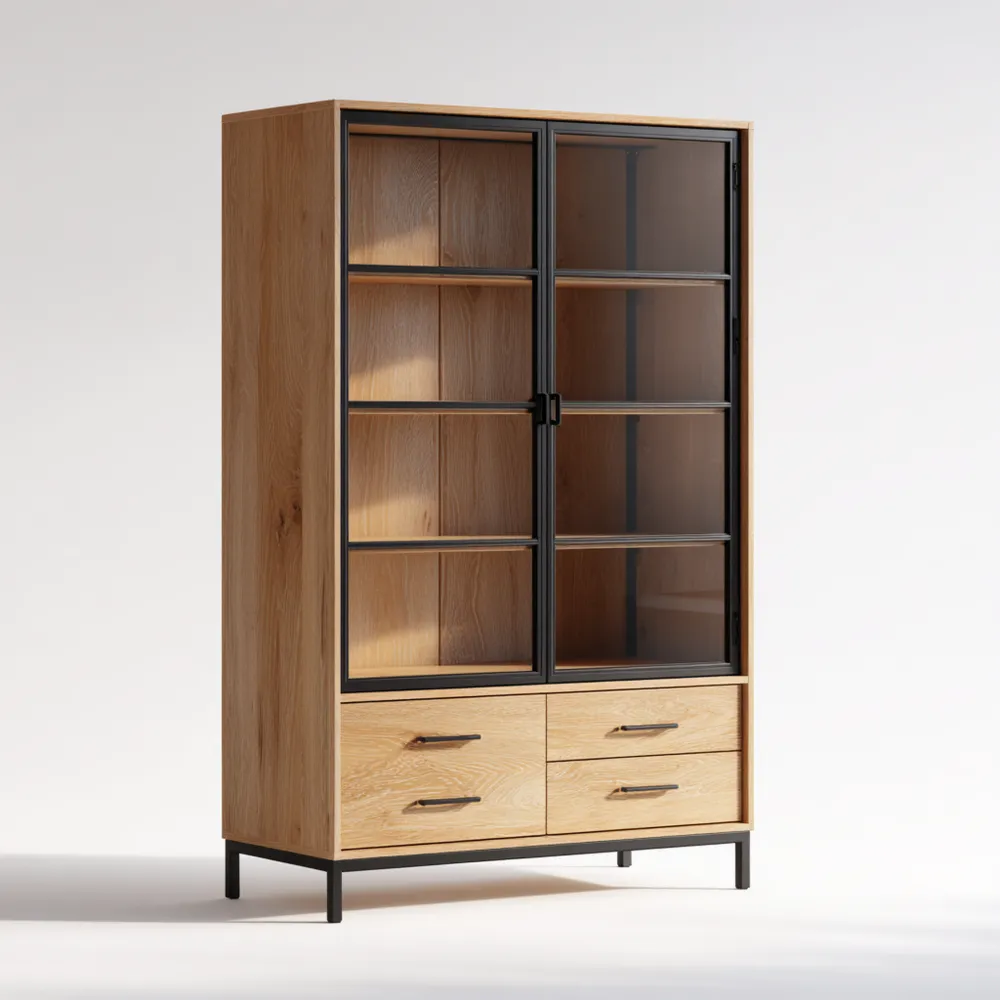 Matériaux et FabricationFabriquée en chêne clair de haute qualité et verre trempé, cette armoire offre durabilité et élégance. La finition naturelle met en valeur le grain du bois, tandis que les portes en verre ajoutent une touche de sophistication.